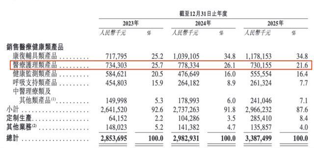 但另一边,这些业务也存在一些问题。比如,招股书显示,作为第二大板块,医疗护理类2025年收入7.30亿元,占比21.6%,该板块主要由医用敷料、造口袋等低值耗材构成,技术门槛极低,市场竞争异常激烈,可孚医疗只能依靠渠道优势和规模效应勉强维持市场份额。