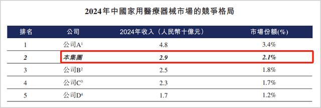 即便是可孚医疗引以为傲、市场份额排名第一的康复辅具类产品,其行业地位也远没有想象中稳固。数据显示,2024年可孚医疗在中国所有康复辅具类产品市场的份额仅为2.4%;而在整个中国家用医疗器械市场中,可孚医疗2024年排名第二,份额约2.1%,与第一名和第三名的差距都微乎其微。